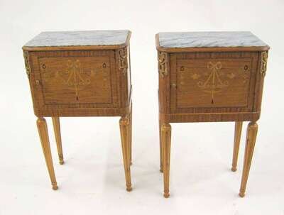 Each with a rectangular marble top above a single cupboard door veneered with ribbon tied garlands, opening to a marble lined interior, raised on round tapered fluted legs. (2).