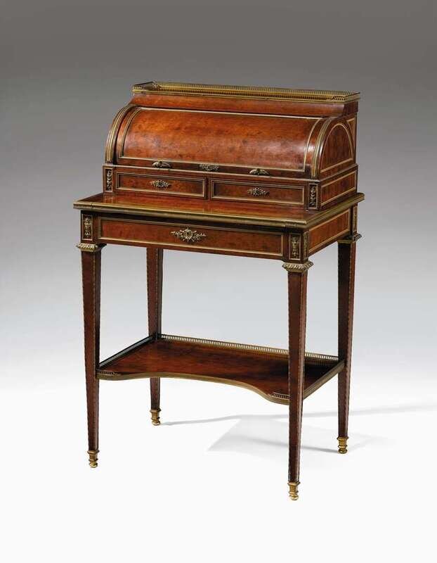 The three-quarter gallery shelf above a roll top opening to reveal drawers above two drawers and a slide out leather inset writing surface with one long drawer, raised on square tapered legs joined by a incurved platform stretcher; the whole outlined with gilt bronze.