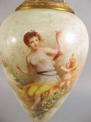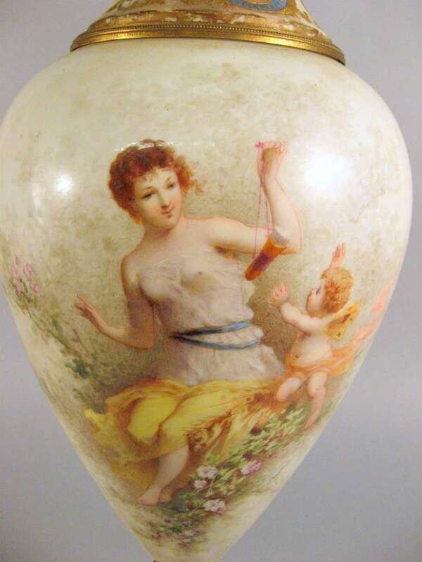 Of baluster form with a foliate painted neck, the body painted with a scene of a classical maiden and cupid, a floral trophy to the reverse, raised on a fluted socle and shaped base; with a reticulated cover.