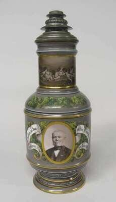With a pewter lid and scroll handle, the cylindrical sides centered by a bust length portrait, raised on a circular stepped foot, blue sceptre and KPM mark.