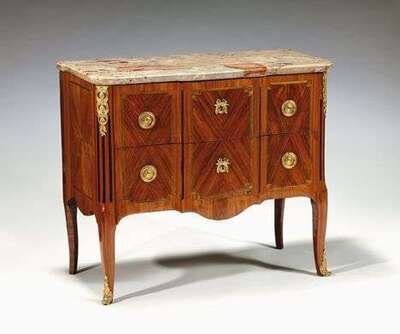 The marble top of breakfront outline above two drawers with quarter veneered reserves, the side panels veneered to match, raised on slightly hipped cabriole legs headed by chutes and ending in sabots. NOTE: JS Stumpf maitre in 1766.