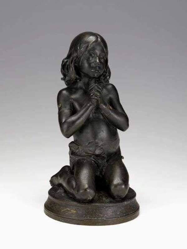 Greenish brown patina, the kneeling figure draped in a pelt, her eyes cast heavenward, signed J. Dampt and dated 1881.