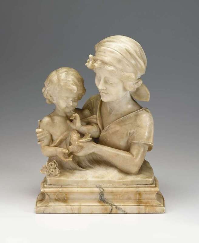 Depicting a young mother and child, a bird in her hand, signed A. Cipriani. NOTE: A. Cipriani either refers to Adolfo or Ada Cipriani, both active sculptors at the turn of the 19th/20th century.