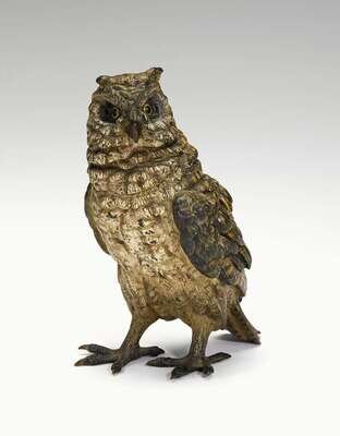 Cold painted bronze, realistically modeled and painted, the head opening to reveal an inkpot, stamped Bergmann and GESCHUTZ.