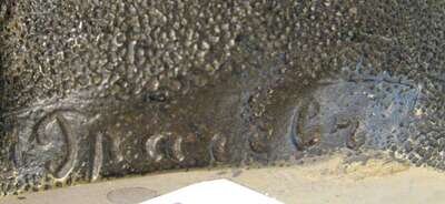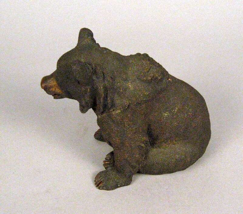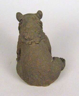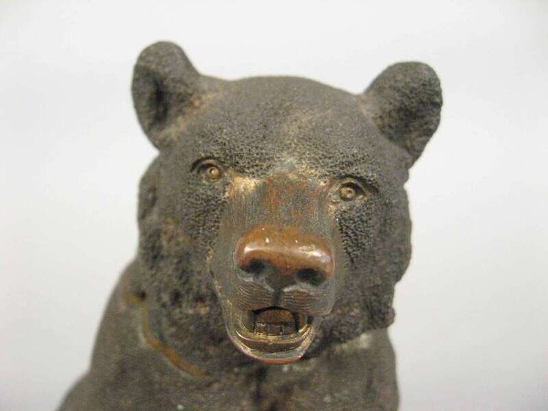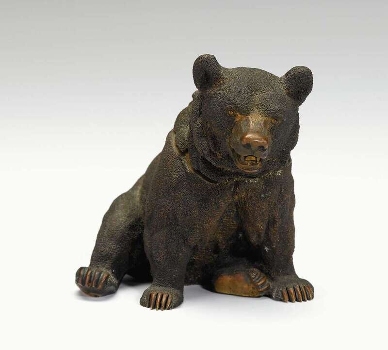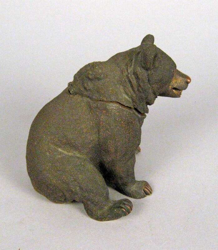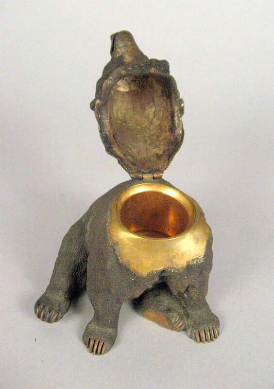 Modeled as a seated bear, the head lifting to reveal an inkpot signed indistinctly.