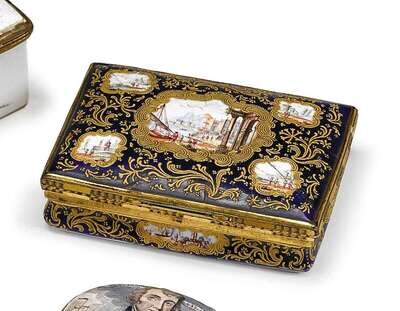 The rectangular box decorated with reserves depicting exotic port scenes against a cobalt ground, with scrolling gilt decoration.