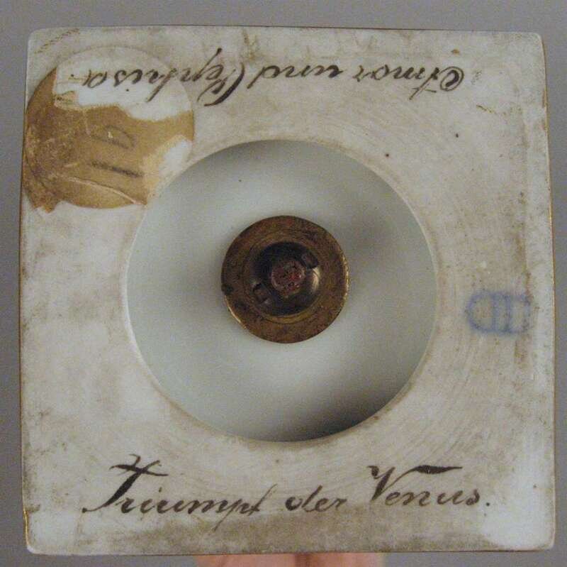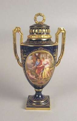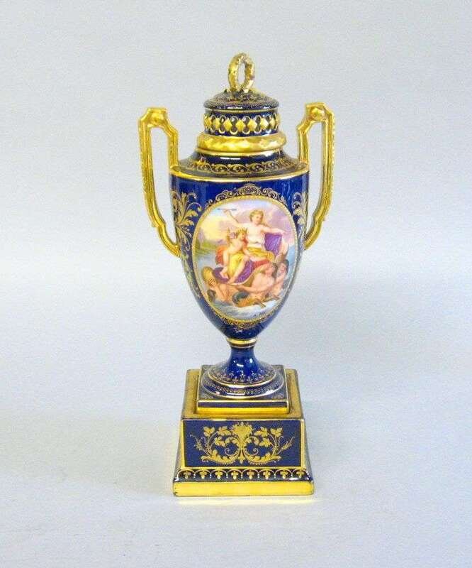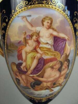 The recticulated cover with wreath form knop, the body with two upright handles centered by a reserve of a classical maiden emerging from the sea and a scene of classical figures discovering cupid at rest, to the reverse, on a cobalt ground with gilt details, raised on a square pedestal base.