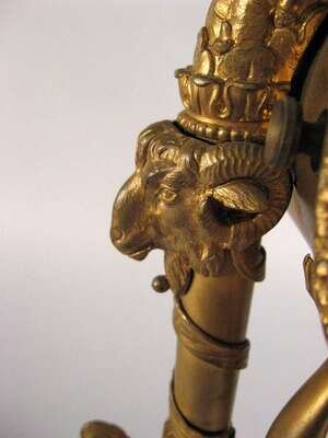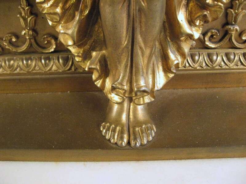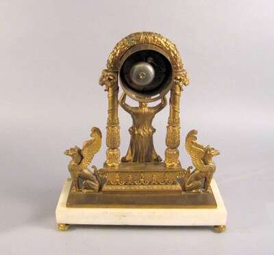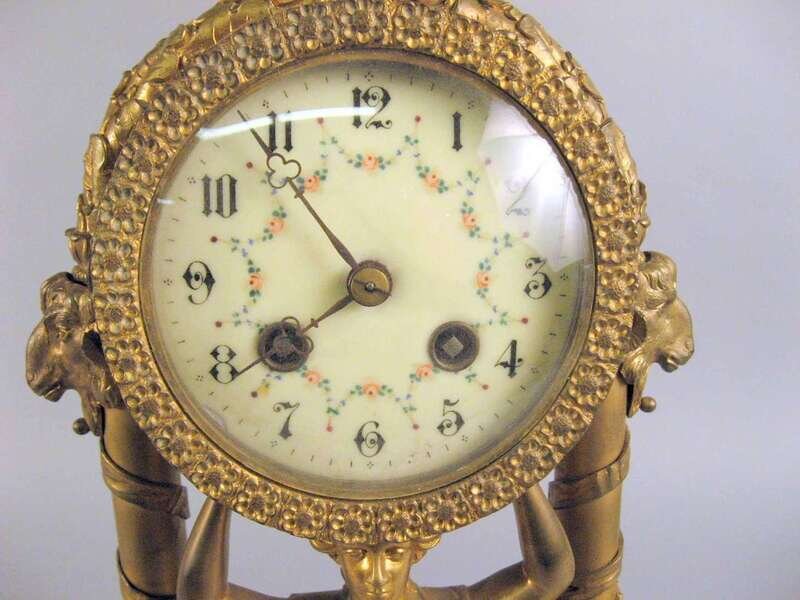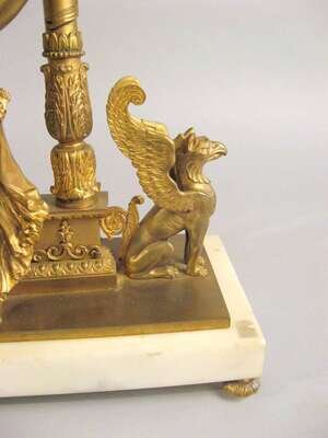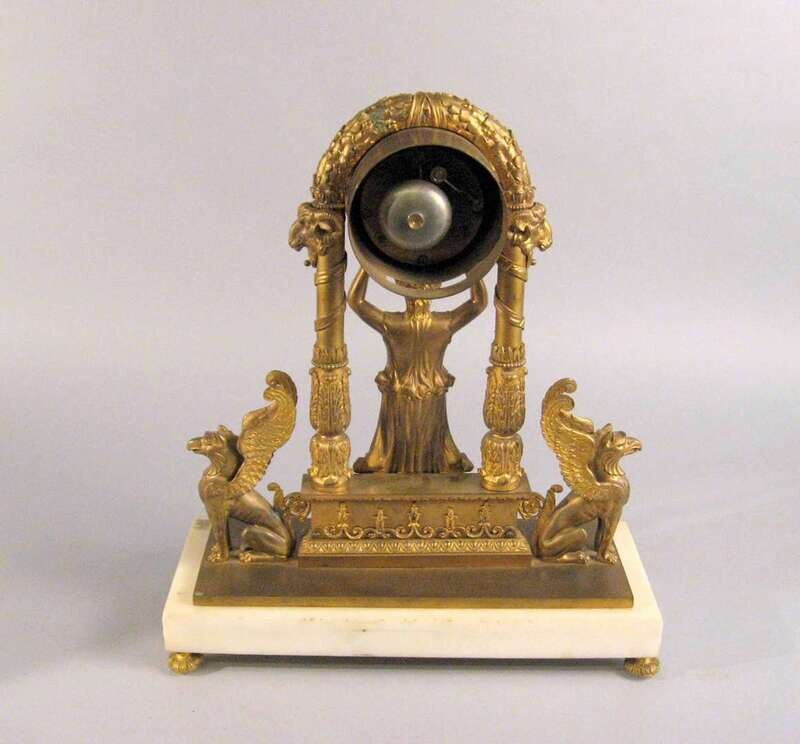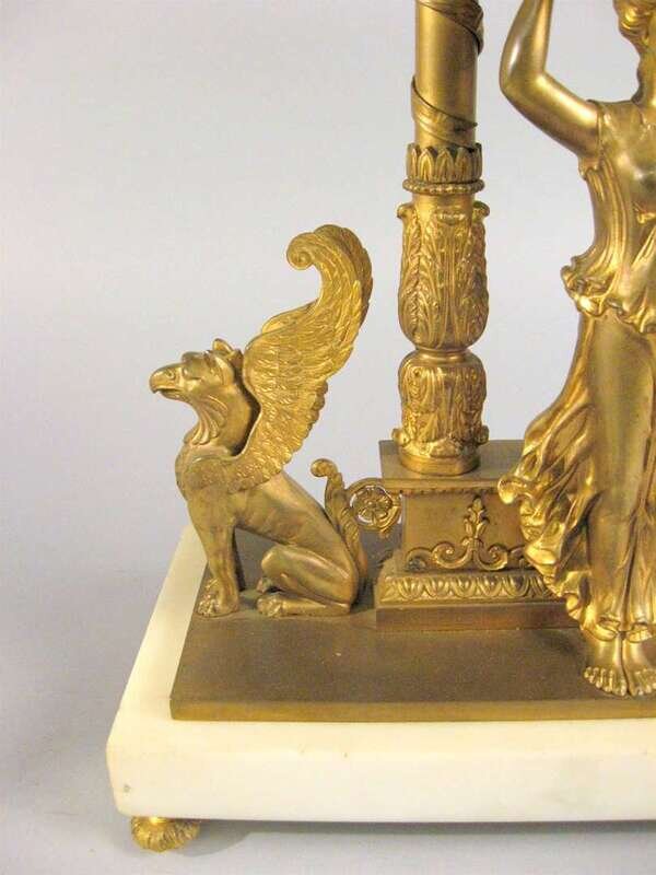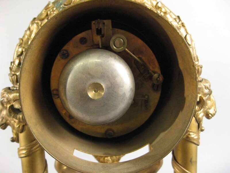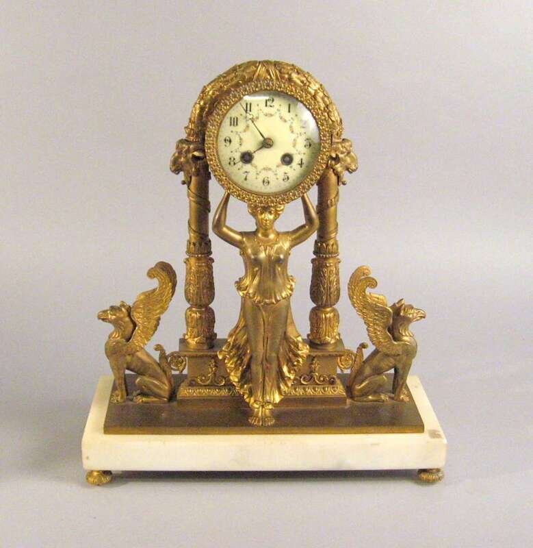 The circular enameled dial with Arabic numerals set within a drum shaped case supported by a classical maiden and flanked by columns surmounted by ram's masks, the further flanking seated griffins raised on a stepped rectangular base.