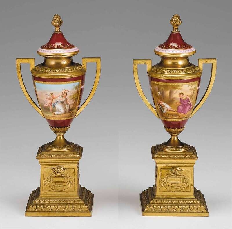Pair of Vienna style gilt bronze mounted porcelain covered urns
