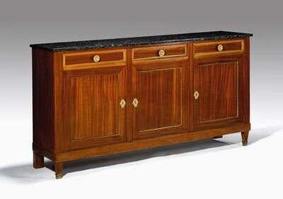 The rectangular black veined marble top above three drawers and three cupboard doors, each outlined in brass, raised on short square legs ending in brass capped feet.