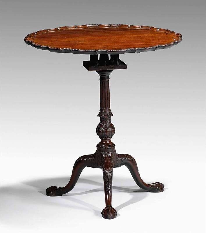 The circular piecrust top on a bird cage and fluted columnar standard, raised on a tripod base with leaf carved cartouches, ending in talon and ball feet.