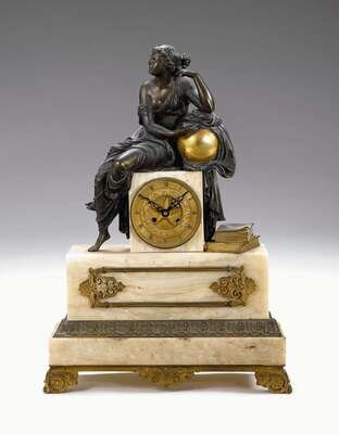The gilt dial with roman numerals surmounted by a draped maiden, the rectangular base with applied decoration and scroll feet.