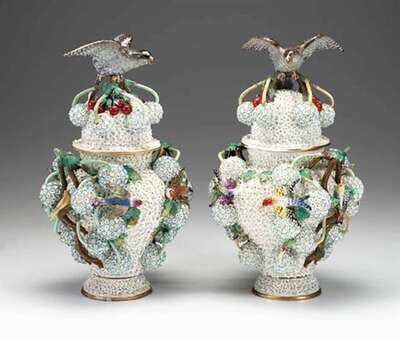 Molded with parrot knops and applied with colorful birds perched upon flowering branches of snowball-shaped flowers with molded branch handles to the sides, underglazed crossed swords mark.