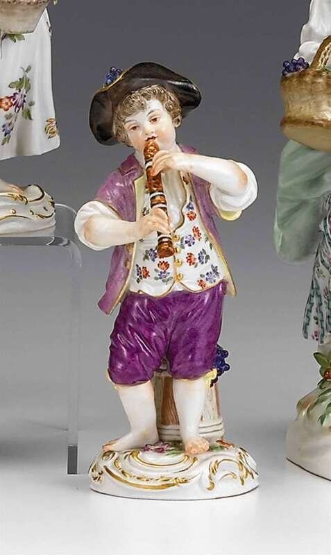 Modeled as a young barefoot boy playing a recorder and standing in front of a staved wooden mug filled with grapes, underglaze blue crossed swords mark, incised 7, impressed 1160 and stamped 'Germany'.