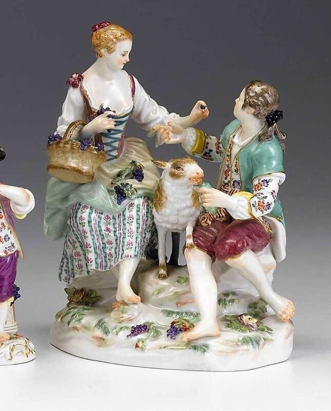 Modeled as a seated barefoot couple, she feeding him grapes from a basket, a sheep between them, on a rocky molded base, underglaze blue crossed swords mark, incised C41, impressed 104.