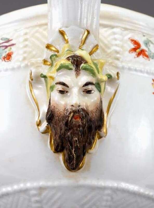The oval tureen and cover with Sulkowski-ozier pattern borders, decorated with lions, herons, and insects with Indianische Blumen, the dome cover with a raised knop finial, the sides issuing foliate handles molded with masks, underglaze blue crossed swords mark.