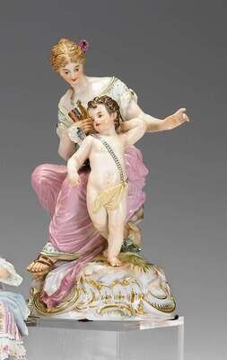 Modeled as a seated Venus confiscating Cupid's bow and arrows, on a rock and scroll molded base, underglaze blue crossed swords mark, incised O 161, impressed 10, painted mark 32.