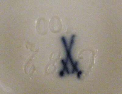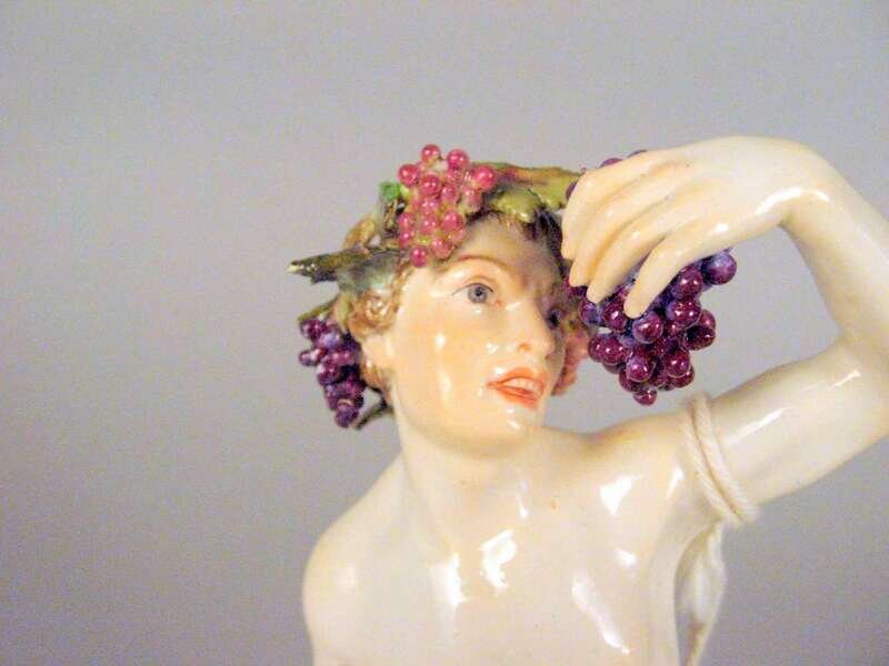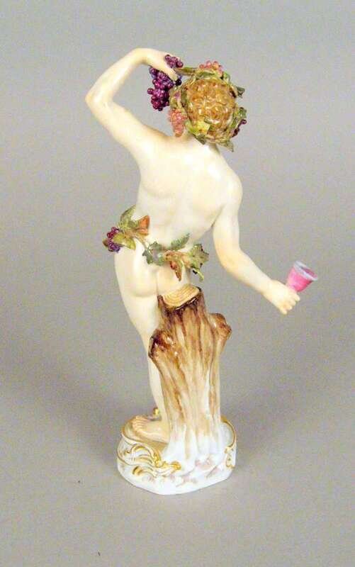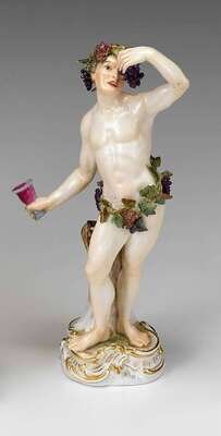 Modeled as a standing figure clad in grapevines and holding a cluster of grapes in his raised left hand, a wine goblet in the other, underglaze blue crossed swords mark, impressed no. 109, incised C82, puce painted 10.