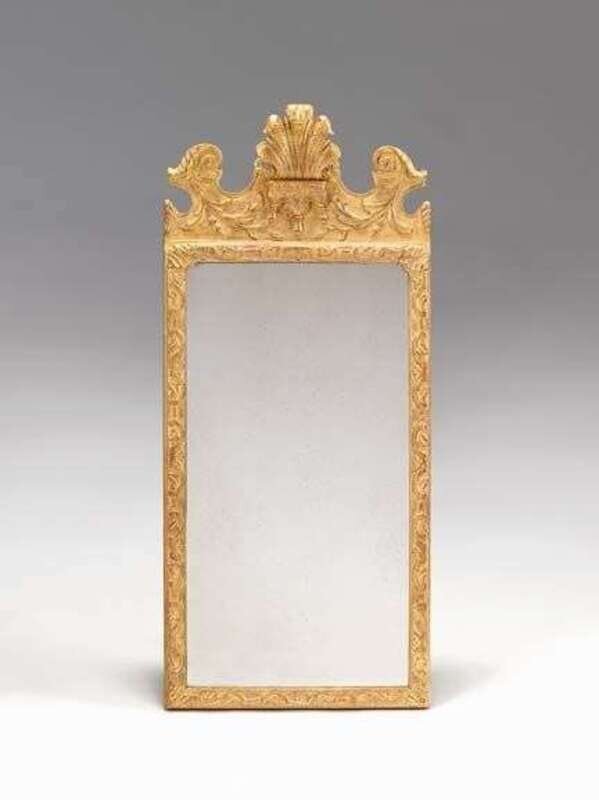 The rectangular plate within a c-scroll and leaf molded frame, surmounted by a conforming vine carved crestrail, centered by a scrolled cartouche.
