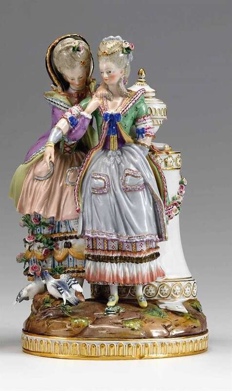 Modeled as two women in 18th century dress standing beside an urn-topped pedestal, a pair of doves and a half-opened letter at their feet, underglaze blue crossed swords mark, incised E90.
