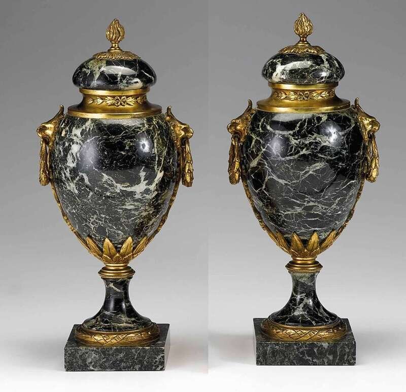 Pair of French gilt bronze mounted Verde Antico marble urns and covers