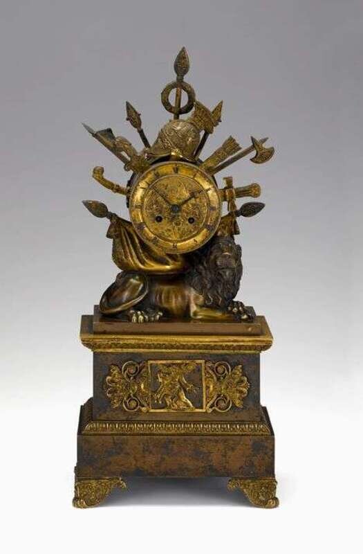 The ormolu chapter ring with Roman numerals set within a drum shaped case stamped Godet and incorporated in a trophy emblematic of war featuring a plumed helmet, spears, arrow filled quiver and swords, a recumbent lion below, all raised on a stepped rectangular pedestal cast with a frieze of a winged infant in battle, upon leafy scrolled feet.