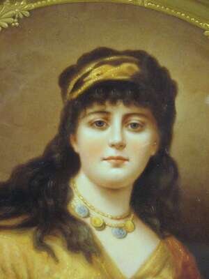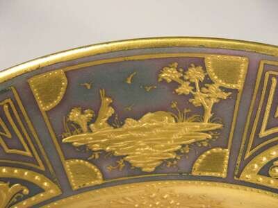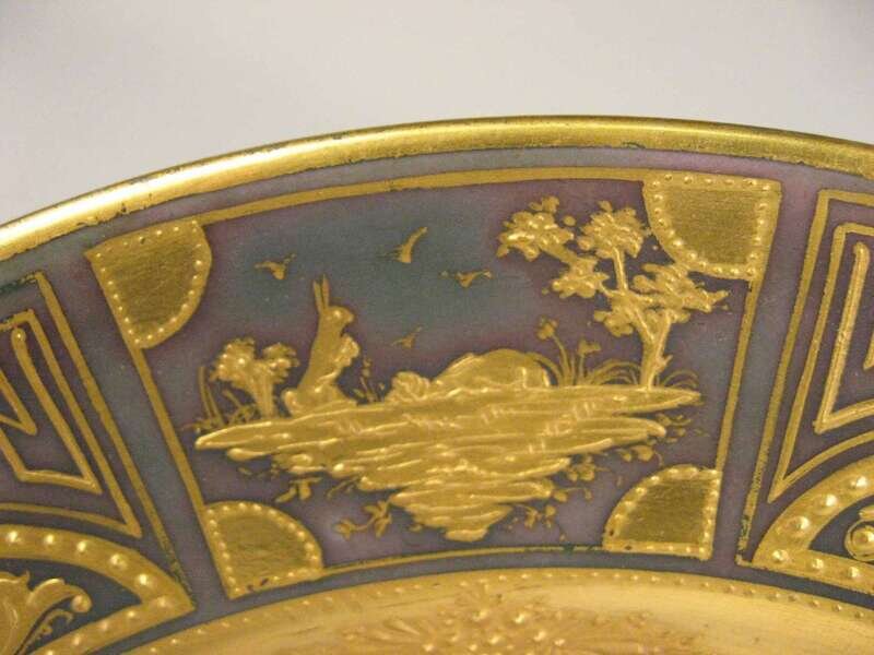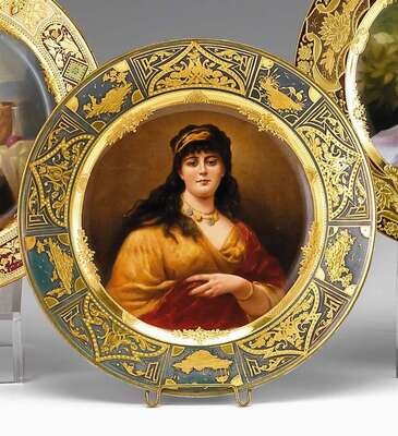 Painted with a portrait of an exotically dressed young beauty against a brown ground, within a raised gilt decorated green border with alternating panels depicting animals in landscapes and flower motifs, underglaze blue beehive mark.