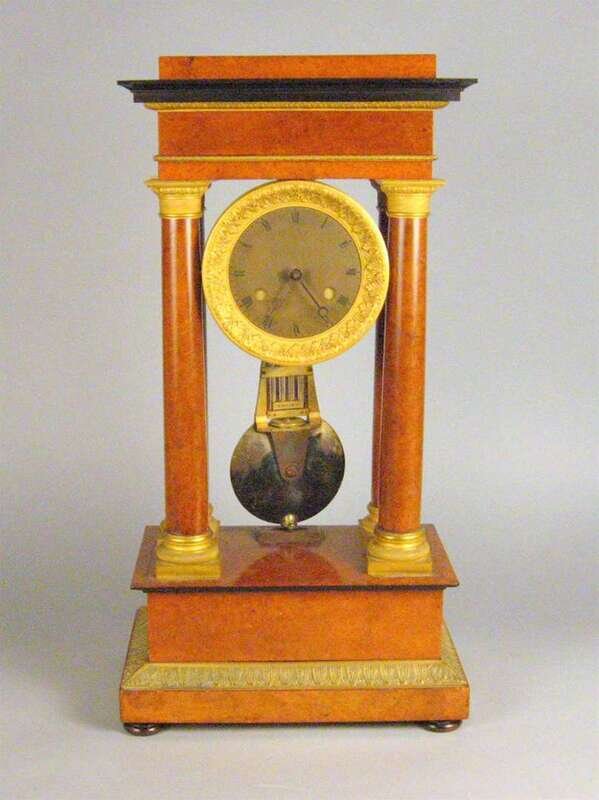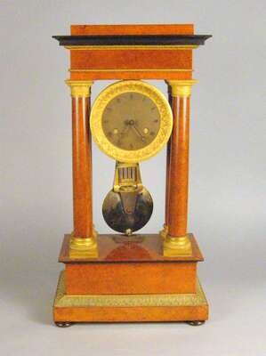 French gilt bronze mounted part ebonized karelian birch portico clock