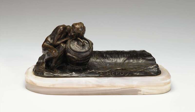 Bronze, dark brown patina, the female nude figure beside a basket formed inkpot, signed Gurschner 1900, upon an onyx base.