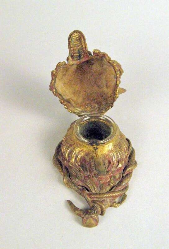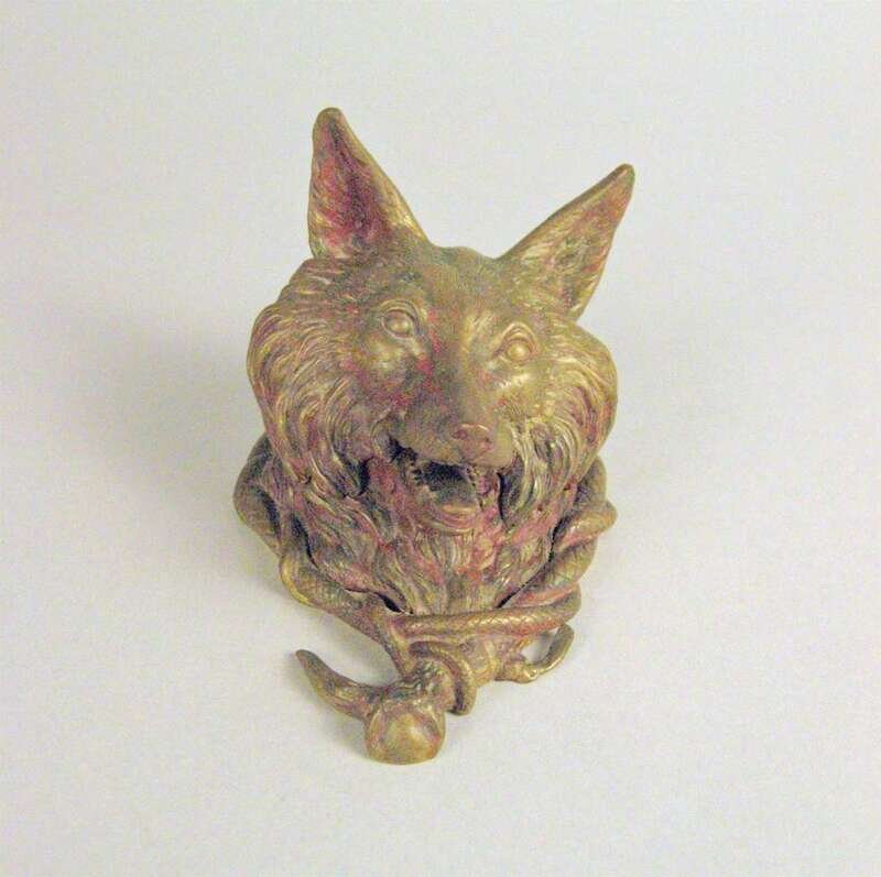 Modeled as the head of a wolf, with a hinged top opening to an ink pot.