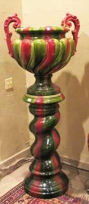 Of lobed urn form, with twin scroll handles, on a spiral twist pedestal, blue and green glaze.
