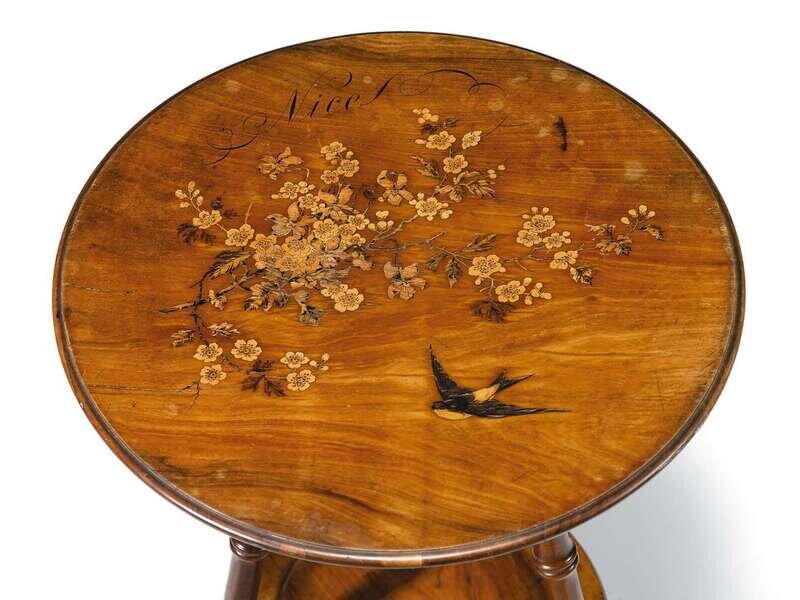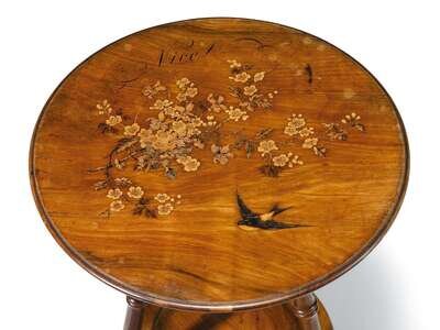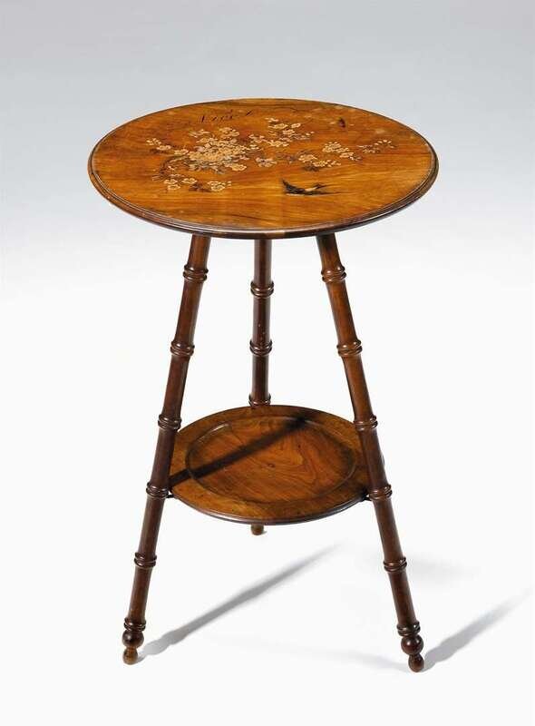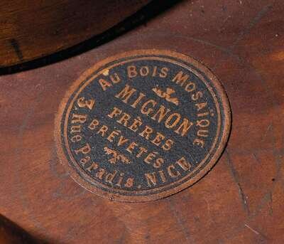 The circular top inlaid with cherry blossoms and a swallow, inscribed in penwork 'Nice', raised on stylized bamboo supports, the underside with a label 'Mignon Freres, Brevetes, Nice'.