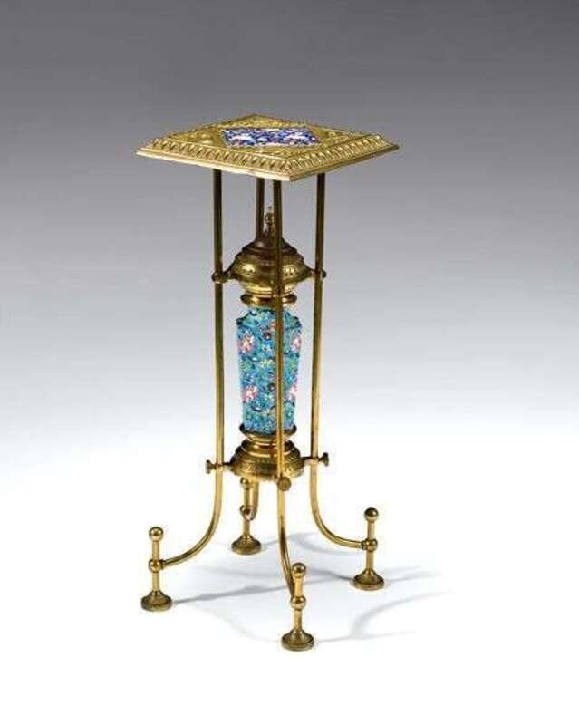 The square brass top inset with a Longwy style floral tile marked 'Gien' cast with stylized dragons and a egg and dart border, above a brass mounted Longwy style octagonal vase, raised on four outswept legs terminating on vertical post feet with circular bases.