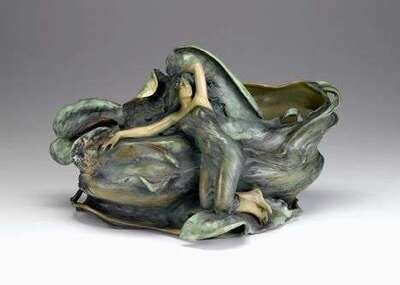 Molded with an Art Nouveau style figure against a bed of water lilies, printed and impressed marks.