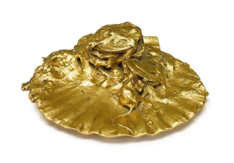 Bronze, gold patina, modeled as a mouse prying open an oyster shell, another shell opens to an inkpot, on a scallop shell and seaweed strewn dish base, signed Sanglan, and stamped Siot-Paris.