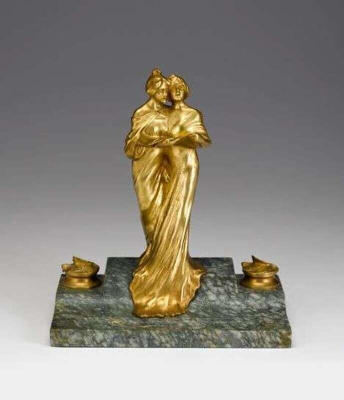 Depicting two standing female figures on a stepped square base flanked by ink pots and a pen rest, stamped with a foundry mark 'colin'.