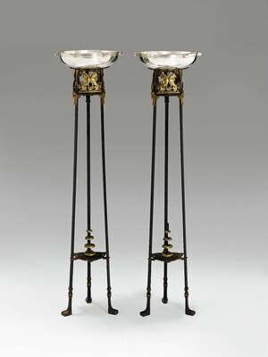 Each with a silver plated bowl marked SK & W, on a tripod base pierced with lions and with a scrolling platform. (2).