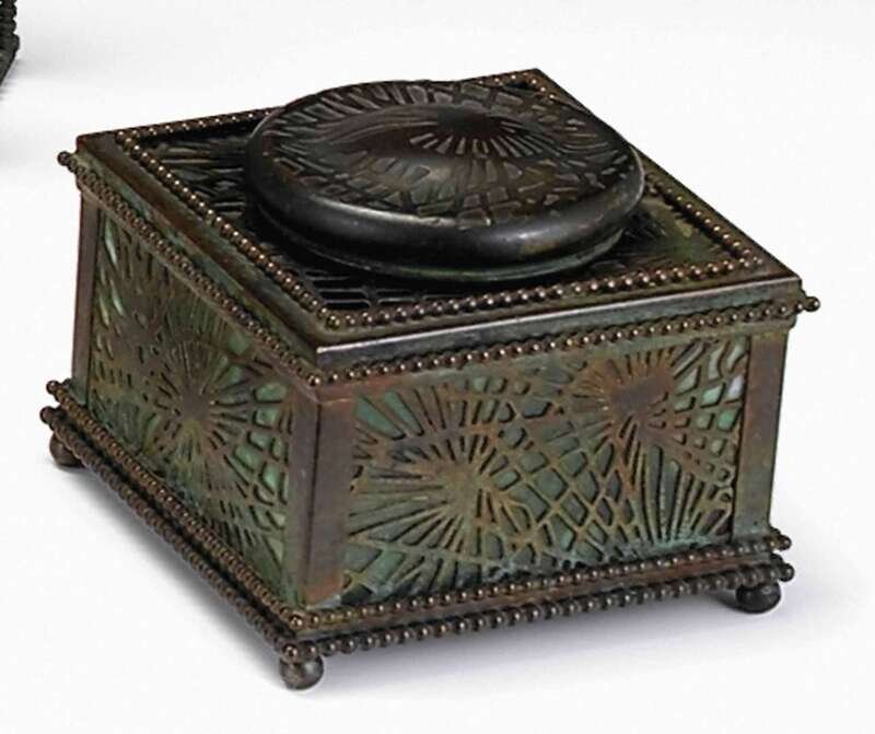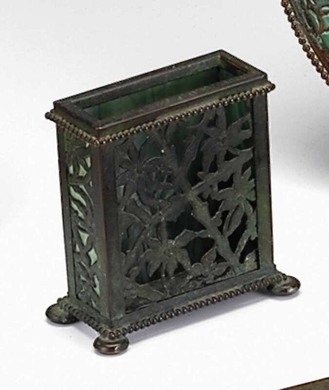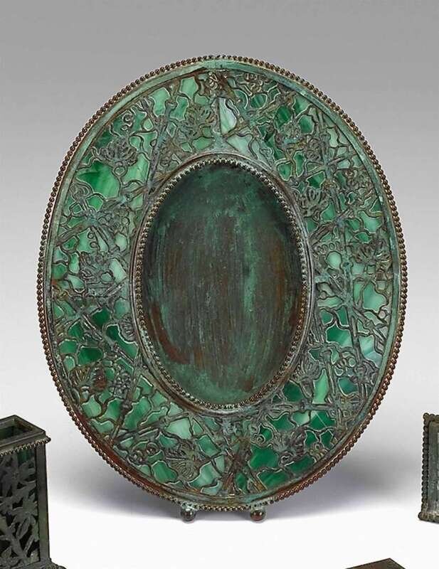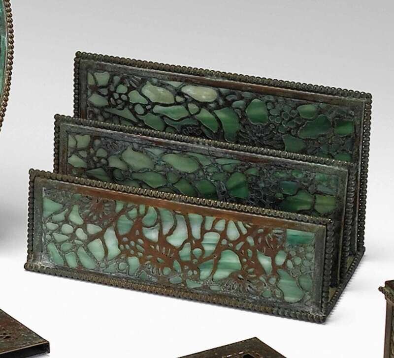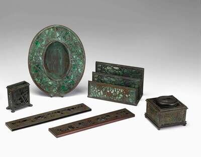 Comprising a 'Pine Needle' inkwell and a pair of 'Grape Vine' blotter ends; marked Tiffany Studios; together with a patinated bronze and leaded glass letter stand, card holder and picture frame. (6).
