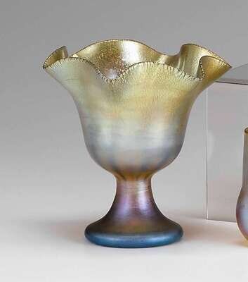 With a ruffled rim and circular foot, signed aurene 217.