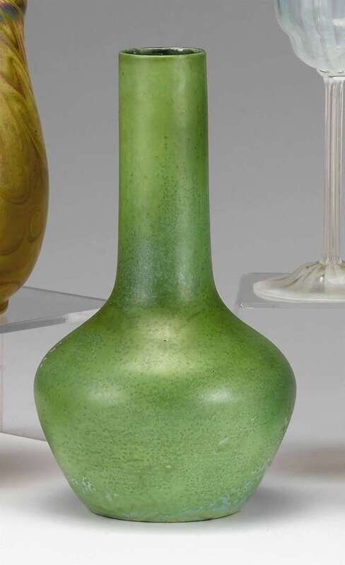 With a tall neck of globular base in a mottled Apple green glaze, marked with LCT cipher to the base.