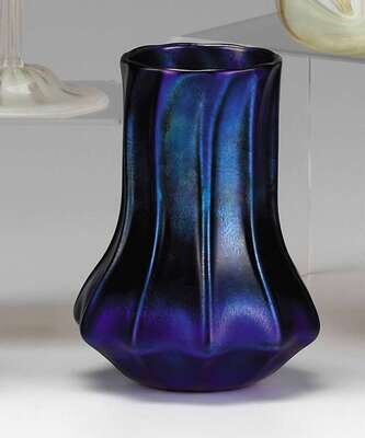 With a ribbed design in purple/blue tones, marked L.C.T and with partial Favrile glass label to the underside.
