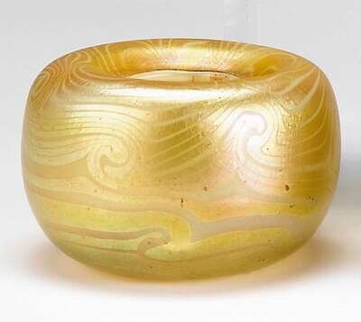 Of flattened cylindrical form with a pulled iridescent design, signed L.C.T Favrile.