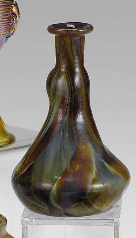 With a flaring neck and swollen body in mottled green and brown tones, partial Tiffany Favrile glass paper label to the underside.