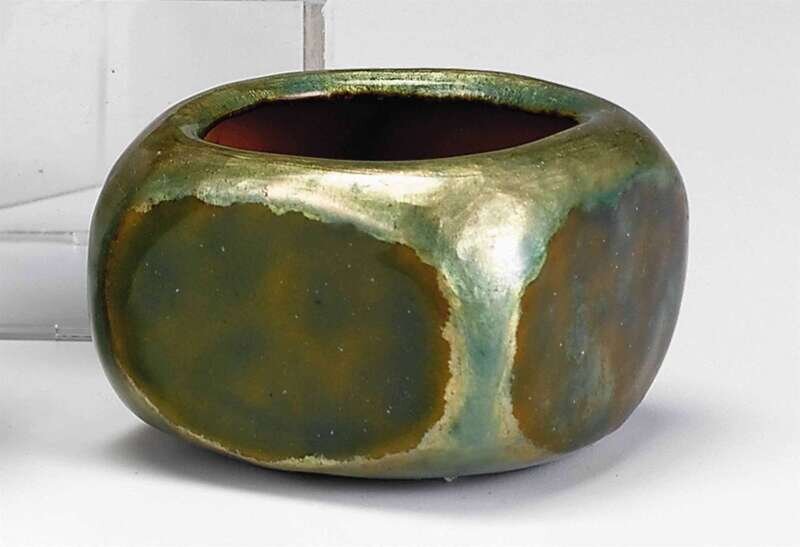 Of square form with rounded corners and an inverted rim, the exterior in green and brown enamel, the interior in ochre enamel, stamped SG179 to base with engraved initials L.C.T.