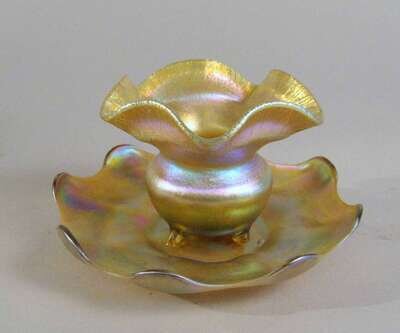 Each with a ruffled edge, the bowl raised on small feet, each signed L.C.T.