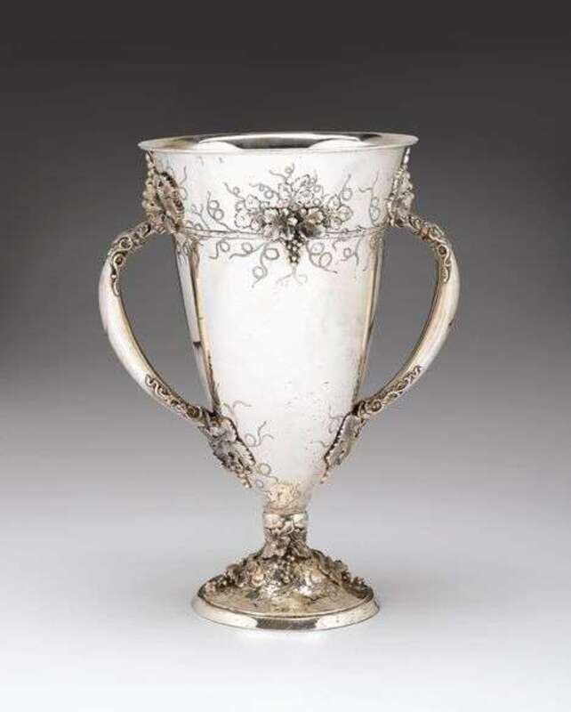 Of trophy form elaborately cast with bacchic vines, raised on a circular foot.