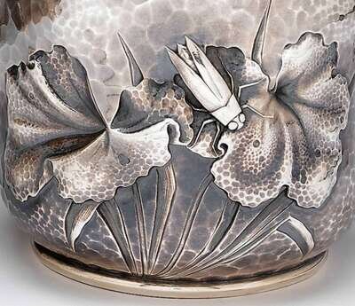 Shaped baluster form with a wavy rim and a spot hammered body and loop handle, deeply embossed with plants and an insect beneath a clouded moon, engraved monogram 'AMC' and inscribed 'Nov. 15th, 1881' to underside, stamped no. 84.