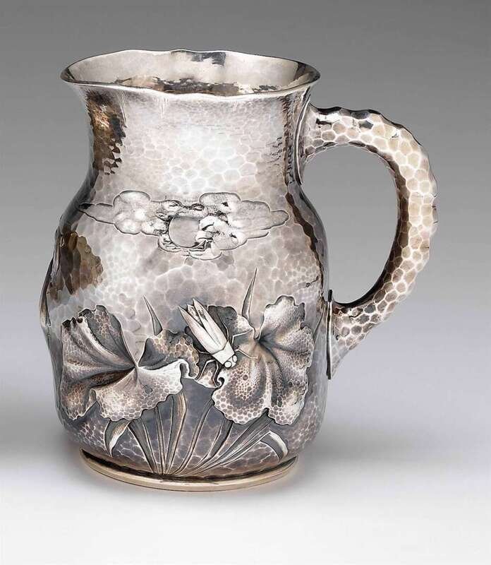 Dominick & Haff sterling silver 'Japanese Style' hammered and embossed water pitcher circa 1880, retailed by howard & co.