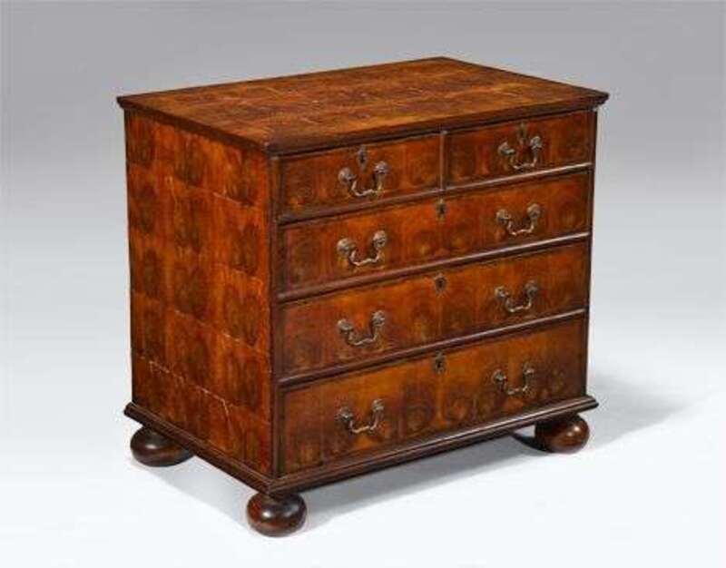 The rectangular feather banded top above two short drawers and three long graduated drawers ending in bun feet.