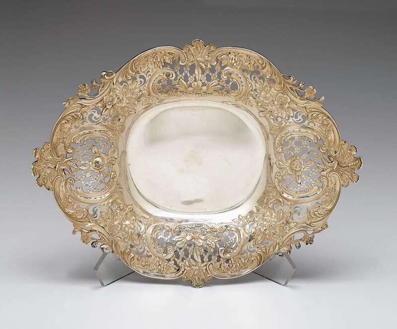 The pierced rim decorated with shells, scrolls and foliate reserves on a latticework ground, raised on leafy paw feet.